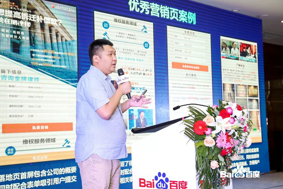 随后,百度商业产品运营部大客户营销顾问詹道吉先生介绍了百度法律服务行业营销生态,展示了百度发挥“搜索+信息流”双引擎优势,细化律师、律所及法律服务平台三大法律行业客群,详细讲述了通过落地页搭建支持、线索转化优化和运营能力开发,提供了针对性和精细化的营销解决方案。