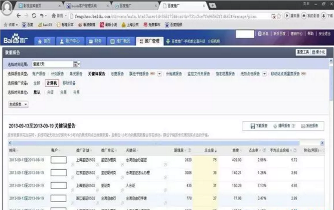 推广报表,百度统计中提供账户、计划、单元、关键词、搜索词等各个维度分设备的报告,第一时间评估无线流量价值。