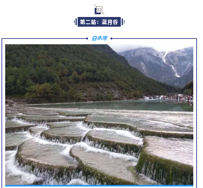 蓝月谷,其前身为早前人们所熟知的“白水河”。在晴天时,水的颜色是蓝色的,而且山谷呈月牙形,远看就像一轮蓝色的月亮镶嵌在玉龙雪山脚下,所以名叫蓝月谷。而白水河这个名字是因为湖底的泥巴是白色的,下雨时水会变成白色,所以又叫白水河