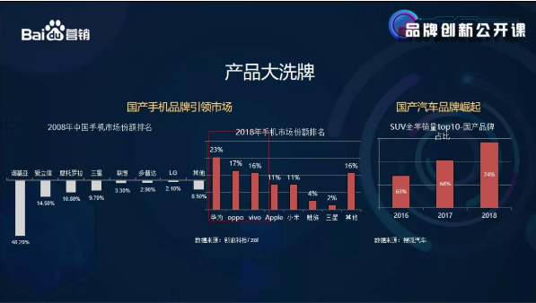 第二个变化是产品大洗牌:以手机市场为例,在07年的时候,最收追捧的外资品牌诺基亚/爱立信/三星/摩托罗拉,而今天早已被国产手机全面超越,取而代之的是华为/oppo/vivo等。