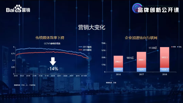 第三个变化,营销大变化:传统媒体效率下降了。传统媒体中最具代表的是中央电视台1套,而中央1套最具代表的是春晚:春晚为传统媒体中,全年收视率最高的节目,受到营销大环境的冲击,很多人已经在抛弃传统媒体,cctv1的收视率同比下降14%。以电视为代表的传统媒体,广告费用近三年基本没有增长,企业主的预算正在大幅度的转向互联网。