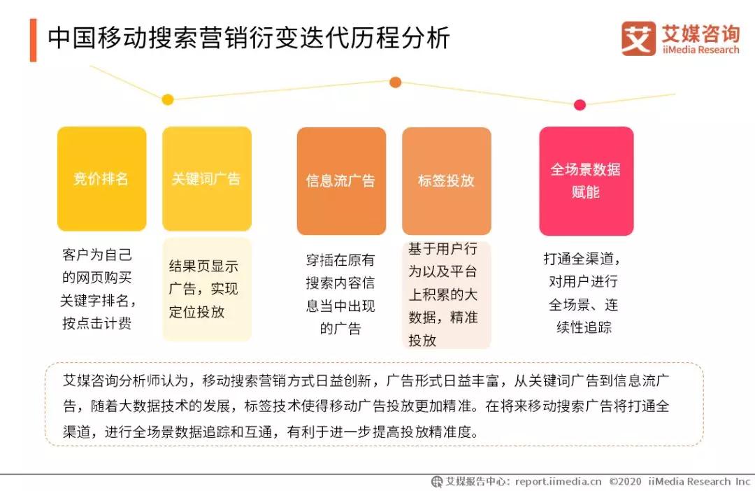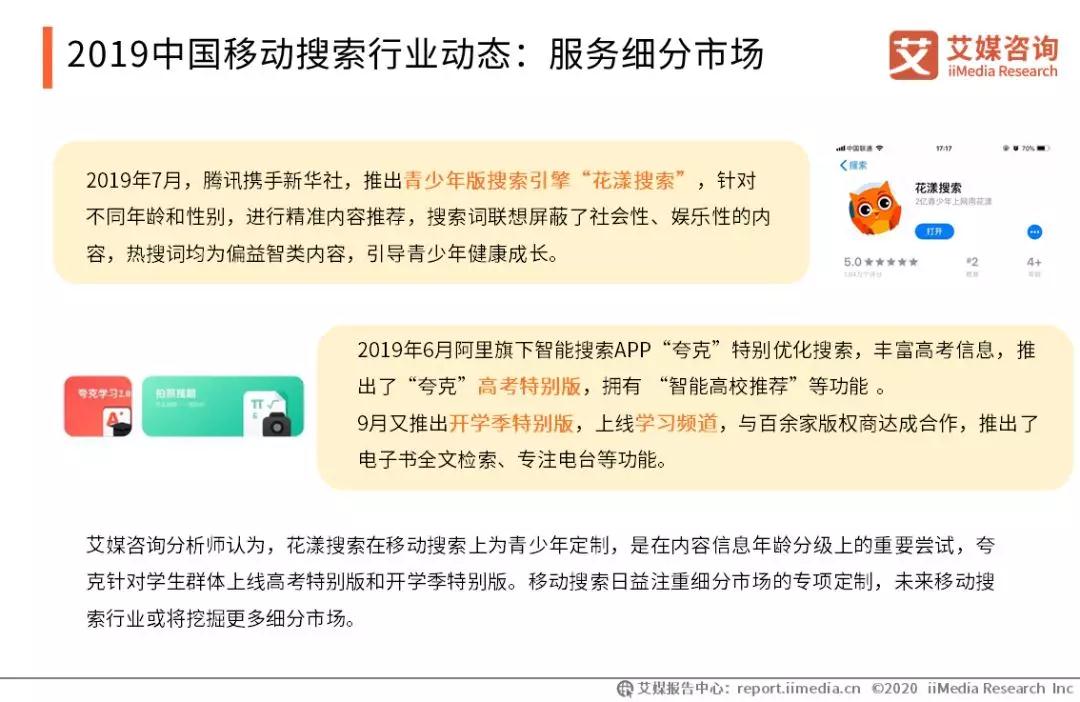 2019中国移动搜索行业动态:营销服务创新艾媒咨询分析师认为,各大搜索平台在营销服务方面都有一定程度的创新,移动搜索营销服务更加细致化、全面化,移动搜索将联动多端、多平台进行营销,提高营销的精准度和个性化程度,为广告主提供新的增长引擎。