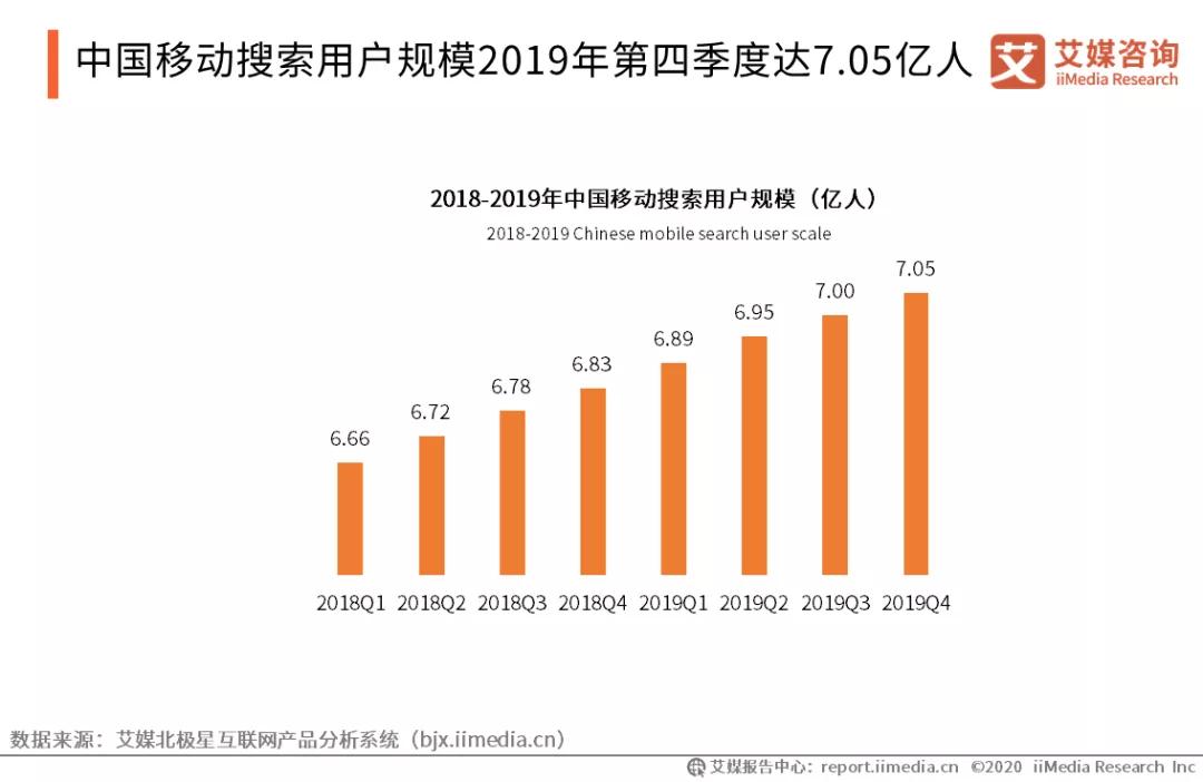 来源:艾媒咨询近日艾媒研究院发布了《2019-2020年中国移动搜索市场运行监测报告》。数据显示,2019年第四季度中国移动搜索用户达7.05亿人。庞大的市场吸引着更多互联网巨头企业布局,阿里巴巴、腾讯、百度等巨头加持的搜索引擎依靠强大的生态引流,具有良好的发展态势。而随着各大平台在搜索营销、垂直搜索等领域的布局加深,中国移动搜索将在2020迎来竞争激烈年。