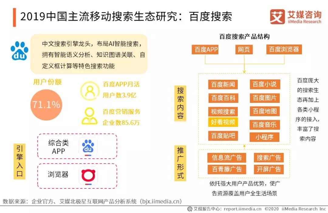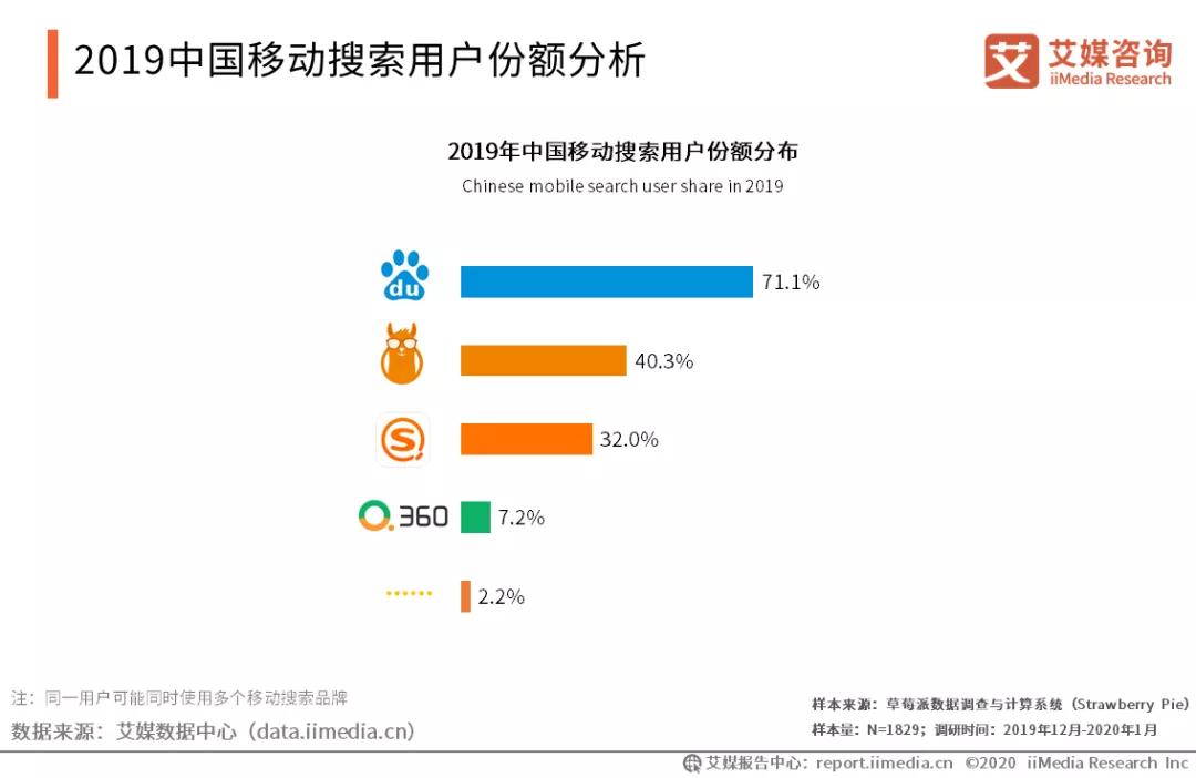 2019中国移动搜索用户份额分析艾媒咨询数据显示,百度移动搜索用户份额占比为71.1%,其次是神马搜索、搜狗搜索和360搜索,占比分别为40.3%、32.0%、7.2% 。艾媒咨询分析师认为,移动搜索行业头部市场主要由互联网巨头平台把持,百度依靠长久累积的用户基础占有较大优势。但阿里巴巴的神马搜索、腾讯系的搜狗搜索等也各自依靠强大的生态引流,在2019年斩获较好的成绩。
