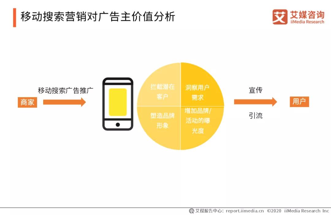 动搜索营销对广告主价值分析移动搜索营销对广告主的商业价值主要体现在四个方面,第一,挖掘并拦截潜在用户,实现引流;第二,通过搜索数据洞察客户需求;第三,增强品牌或活动的曝光度,提升用户的品牌熟悉度。第四,塑造品牌形象,提升用户对品牌的好感度。艾媒咨询分析师认为,移动搜索广告和其他广告形式的不同之处在于,一方面宣传目标更加精准,移动搜索广告可以通过对用户属性的追踪实现定向推广,并能通过数据反馈了解客户需求;另一方面相比传统广告宣传成本更低,企业能以更低的花费获取更高关注度。