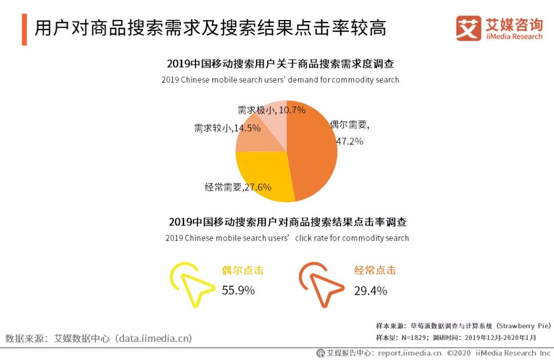 用户对商品搜索需求及搜索结果点击率较高艾媒咨询数据显示,仅有10.7%的用户表示需求极小。在使用过商品搜索功能的用户中,85.3%的用户会点击商品搜索结果。艾媒咨询分析师认为,超七成用户对商品搜索的需求度较高,在用户进行商品信息搜索的同时,搜索引擎可以提供价格比对、促销信息及购买渠道推介等服务内容,移动搜索或将成为未来商品营销的重要手段。