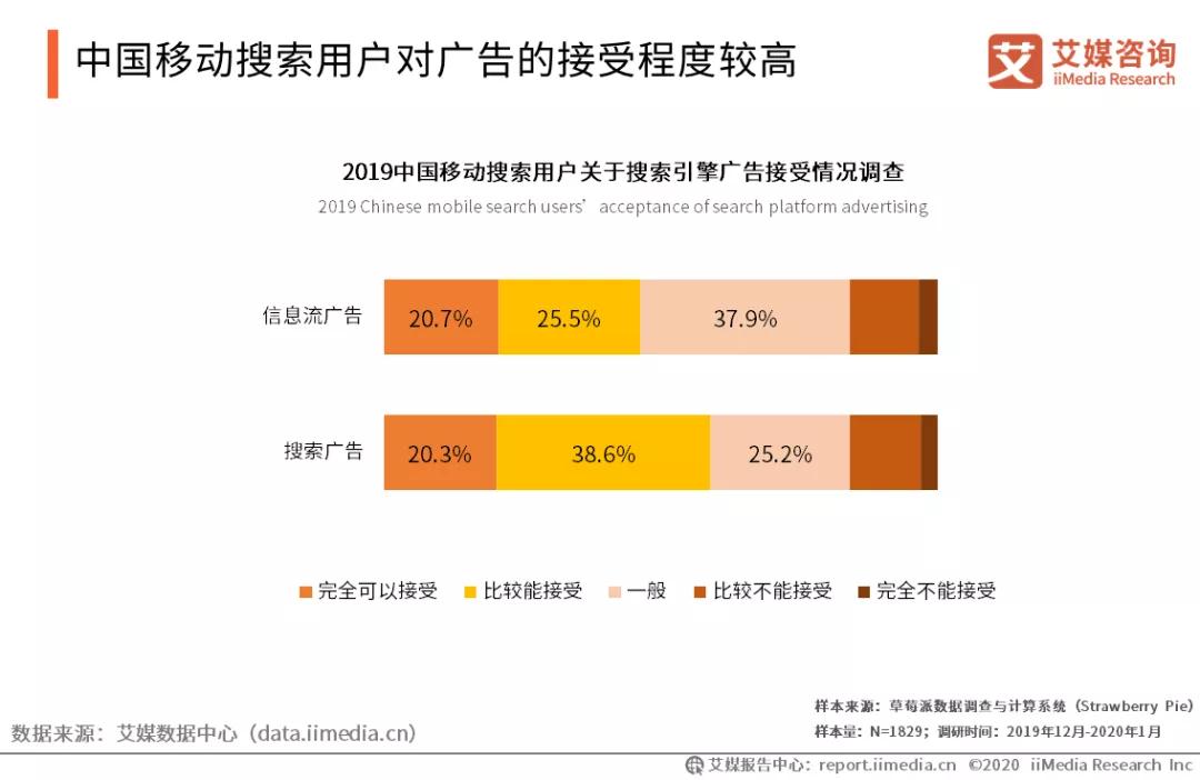中国移动搜索用户对广告的接受程度较高艾媒咨询数据显示,中国移动搜索用户对广告的接受程度较高,46.2%的用户表示能够接受信息流广告,58.9%的用户表示能够接受搜索广告。艾媒咨询分析师认为,营销广告是搜索平台运营的重要一环,随着搜索营销的普遍化,用户对于搜索平台广告的接受程度也比较高,未来AI智能广告投放逐渐普及的背景下,用户接受程度有望进一步提高。