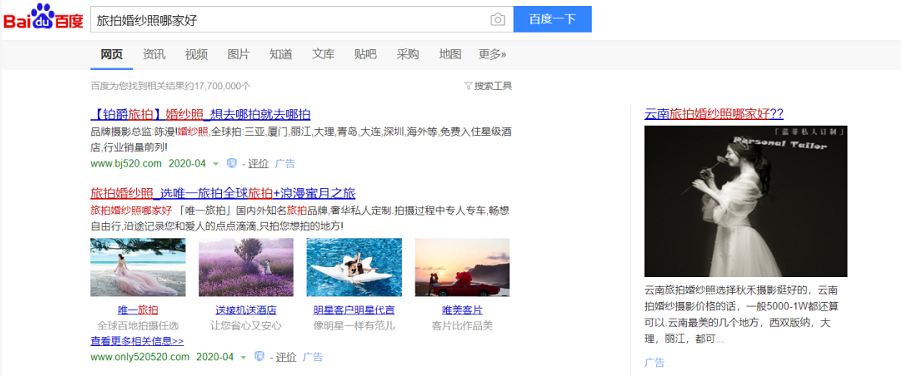 疫情过后,恰逢五一节将至,万物复苏,不少人想借此机会,留下美好的回忆。市场需求的增加,使婚摄市场迎来了行业推广高峰期,有从业者表示:摄影行业这段时间的订单量占全年的40-50%,因疫情形势有所缓解、温度适宜、商家促销力度大是许多人选择这一时段拍写真照的主要原因。下面来看几个摄影行业热门推广案例。贵州贵阳百度公司小徐为您解析: