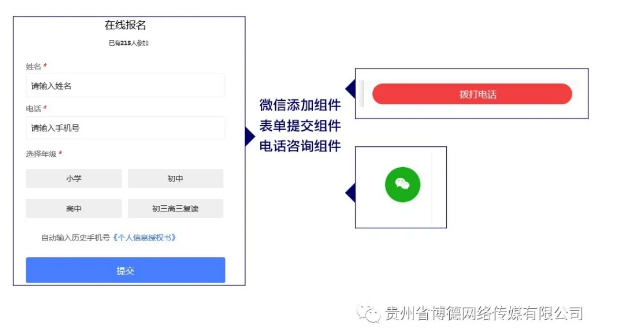 ◆咨询组件丰富,有微信添加组件,表单提交组件、电话咨询组件、线上咨询组件。给学生家长多种咨询方式,方便选择。