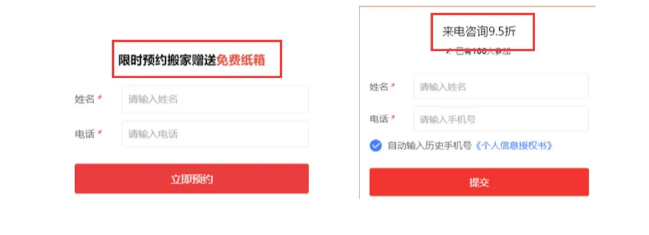 ◆咨询框/表单/电话按钮,稍稍口语化的表达,并添加常用咨询语或顾客有利可图的词,有效提升线索量。