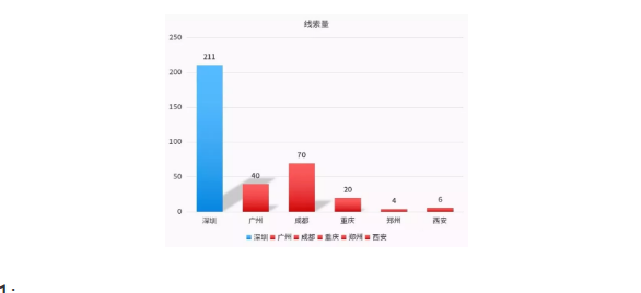 成都的平均线索成本是六个城市中最低的,但是线索量也只有70个,虽然比上面四个城市稍微高一些,但是相对于深圳的211个线索量还是偏低的。