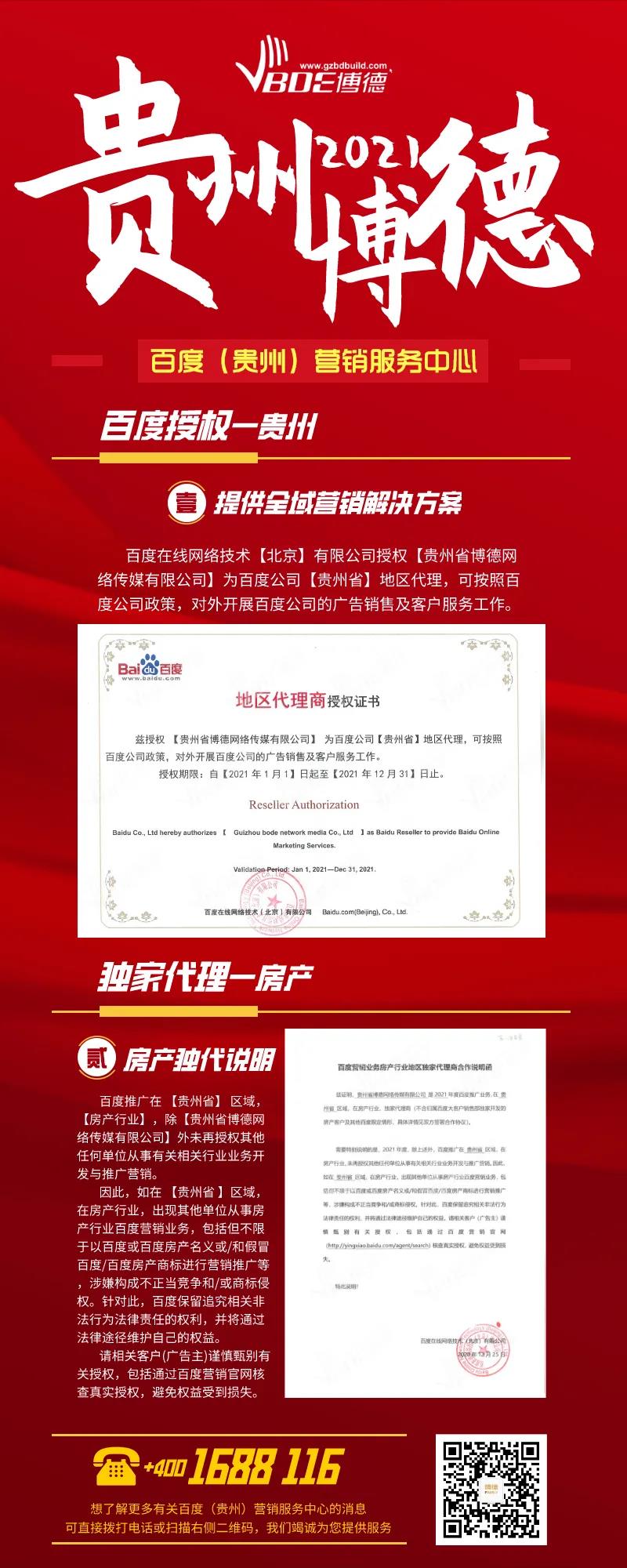 2020年12月15日,百度在线网络技术(北京)有限公司正式授权贵州省博德网络传媒有限公司是2021年百度推广业务在贵州省区域房产行业的独家代理商,负责在贵州省区域内的房产行业业务开发与推广营销。 2021年度百度将贵州省区域的房产行业业务开发与推广营销独家代理权授权于贵州省博德网络传媒有限公司,未授权的其他任何单位不得在贵州省区域内从事房产行业百度营销业务。 如在贵州省区域出现其他单位从事房产行业百度营销业务,包括但不限于以百度或百度房产名义或/和假冒百度/百度房产商标进行营销推广等,涉嫌构成不正当竞争和/或商标侵权,百度和贵州博德将保留追究相关非法行为法律责任的权利,并将通过法律途径维护自己的合法权益。请相关客户(广告主)谨慎甄别有关授权,包括通过百度营销官网(http://yingxiao.baidu.com/agent/search)核查真实授权,避免权益受到损失。