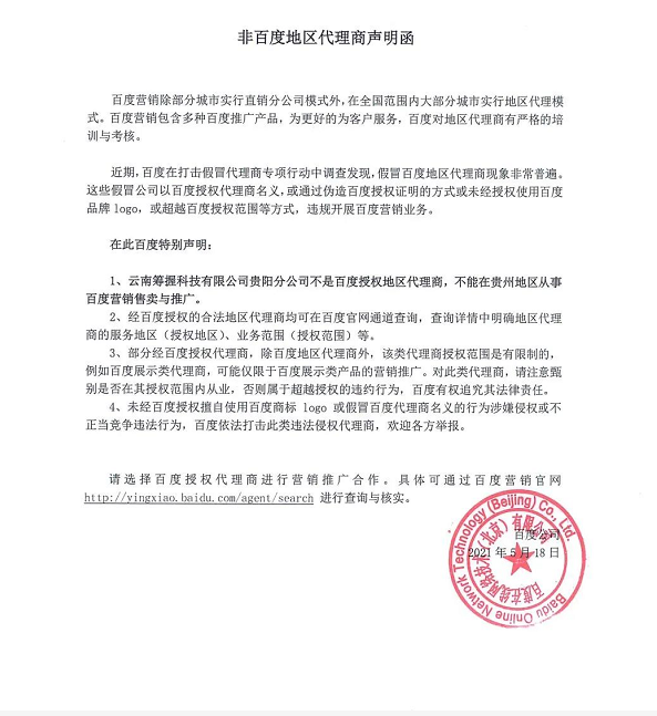 百度特此声明如下!(后附贵州百度代理商名称及官网)