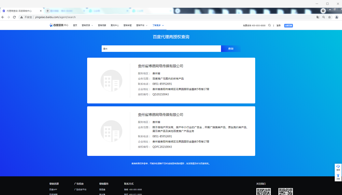 附: 贵州省博德网络传媒有限公司百度贵州公司官网:http://www.sem12.com/ http://gzbdbuild.com/ 百度代理商验真查询渠道: http://yingxiao.baidu.com/agent/search